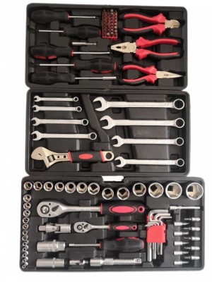 Caixa de metal com 103 ferramentas Cromo Vanádio, muito sólida e com rebites de metal. Contém 3 gavetas, gavetas bem resistentes e flexível para abrir. Cada gaveta é completa de ferramentas, o conteúdo de cada gaveta é: