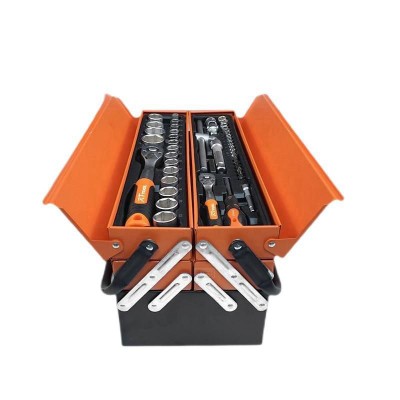 Caixa de metal com 85 ferramentas Cromo Vanádio, com 5 gavetas flexíveis para abri-lo. Cada gaveta é completa de ferramentas, o conteúdo de cada gaveta é: