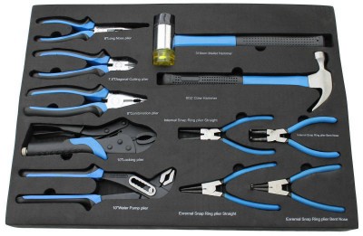 Quarta gaveta: alicate de bomba de água, alicate de freio, martelo de garra, martelo, alicate de ponta longa, alicate de combinação, alicate de bloqueio, alicate diagonal.