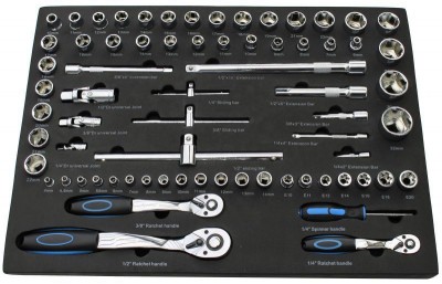 Primeira gaveta: soquetes, barras deslizantes, barras de extensão, juntas universais, alça giratória, alças de catraca.