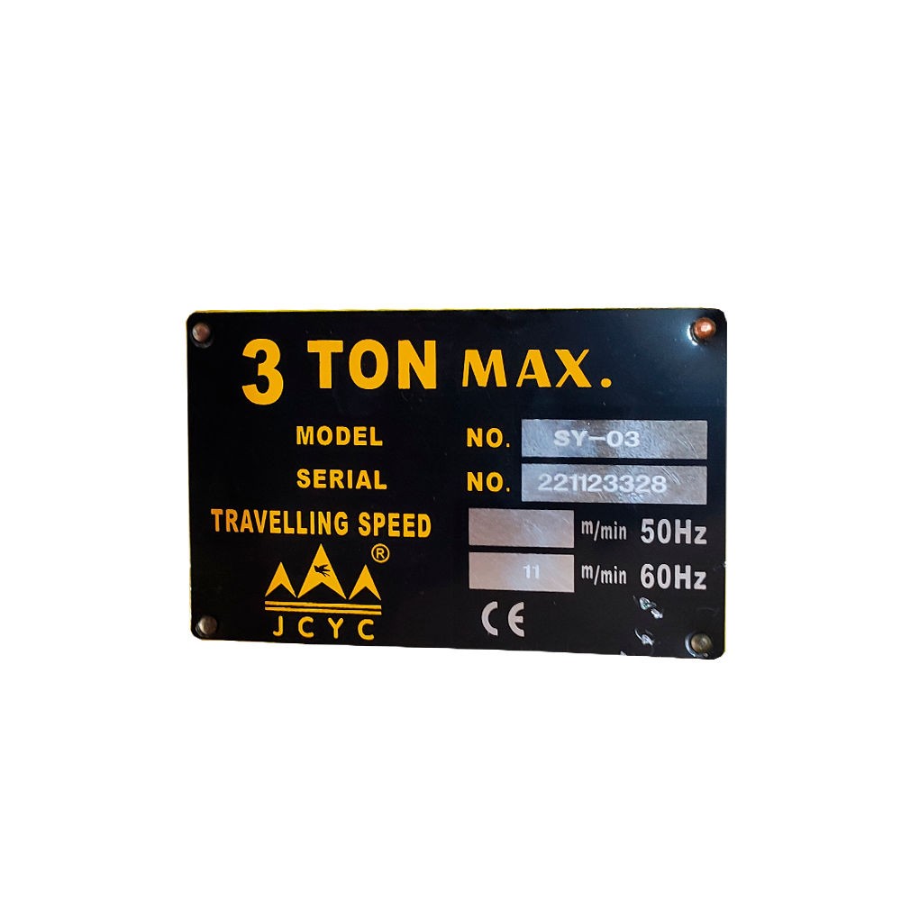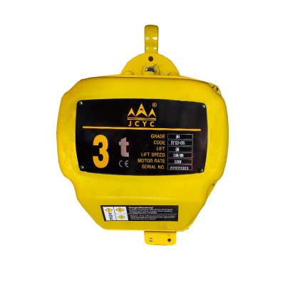Talha Elétrica com motor elétrico, capacidade máxima de elevação de 3.000 Kg, com corrente que se estende até 6 metros, trifásico, frequência de 60Hz, voltagem de 220/380V, para elevação horizontal e deslocamento de cargas, velocidade simples de 6 metros por minuto. Grau de proteção IP54.