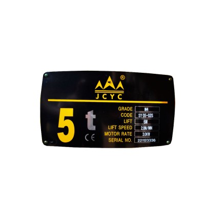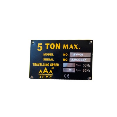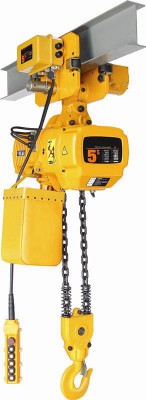 Talha Elétrica com motor elétrico, capacidade máxima de elevação de 5.000 Kg, com corrente que se estende até 6 metros, trifásico, frequência de 60Hz, voltagem de 220/380V, para elevação horizontal e deslocamento de cargas, velocidade simples de 6 metros por minuto. Grau de proteção IP54.