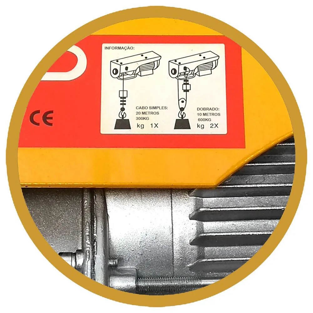 Talha Elétrica - PA600 Talha de pequeno porte com motor elétrico, com capacidade de elevação de 300 a 600kg, cabo de aço extensivo de 20 metros, 60hz de frequência, 220v, velocidade de 10/5 metros por minuto, sem trolley.